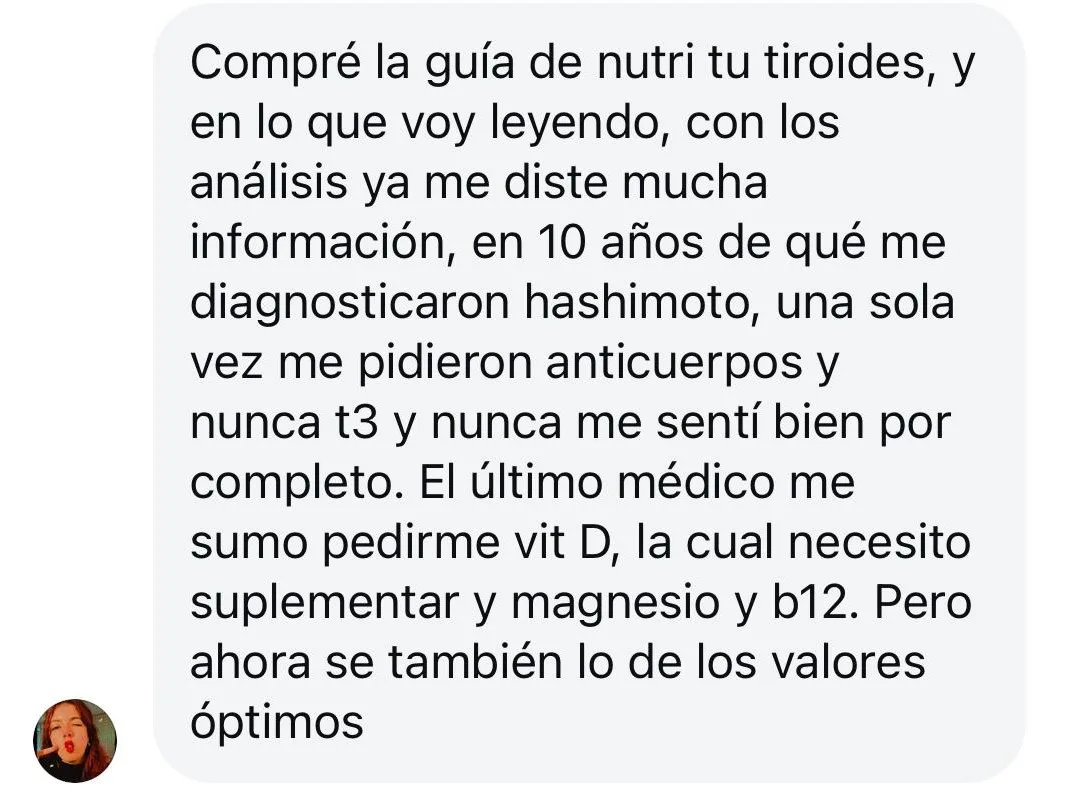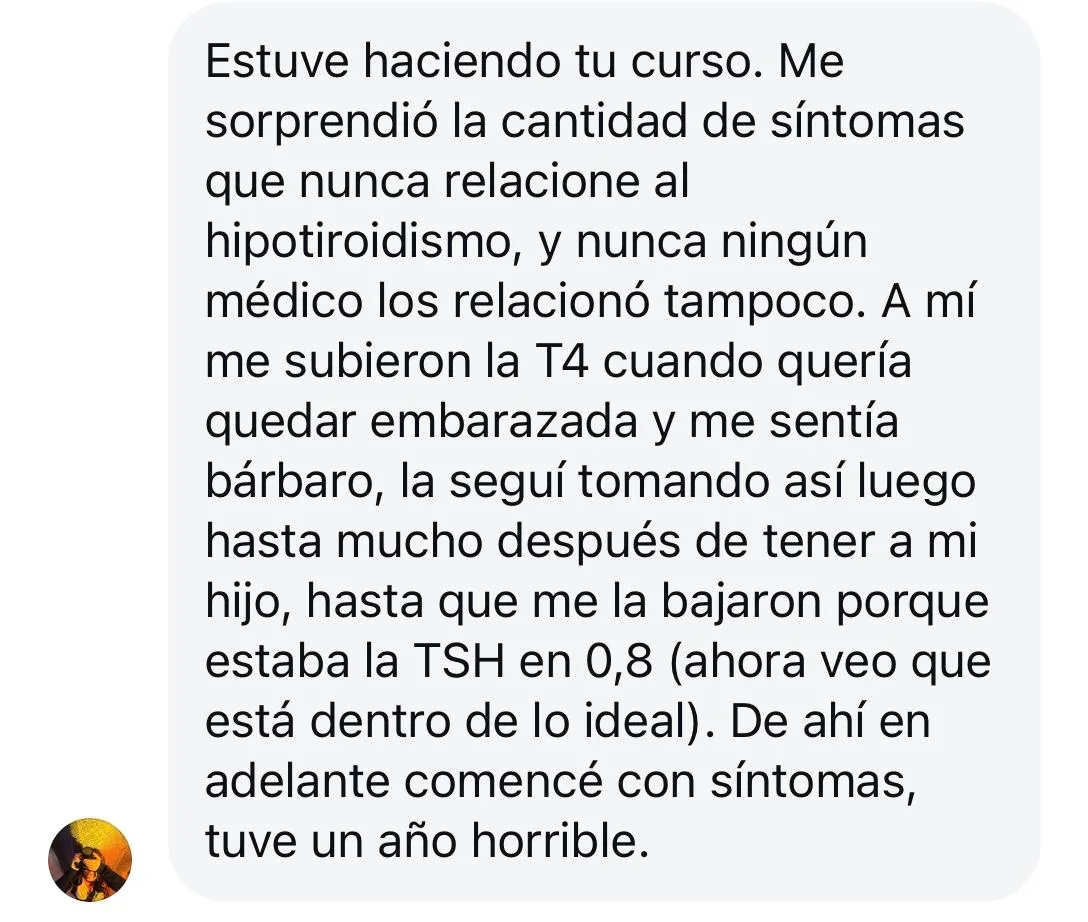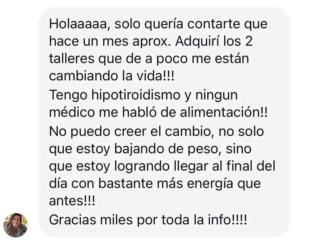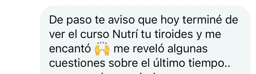 Mi endocrinóloga vio los análisis después de haber hecho “nutrí tu tiroides” y me dijo que íbamos a probar bajar la medicación. ¡Gracias, gracias, gracias! Nunca pensé que eso era una posibilidad y es todo gracias a tu curso.
