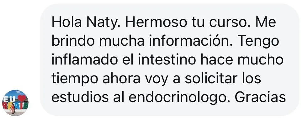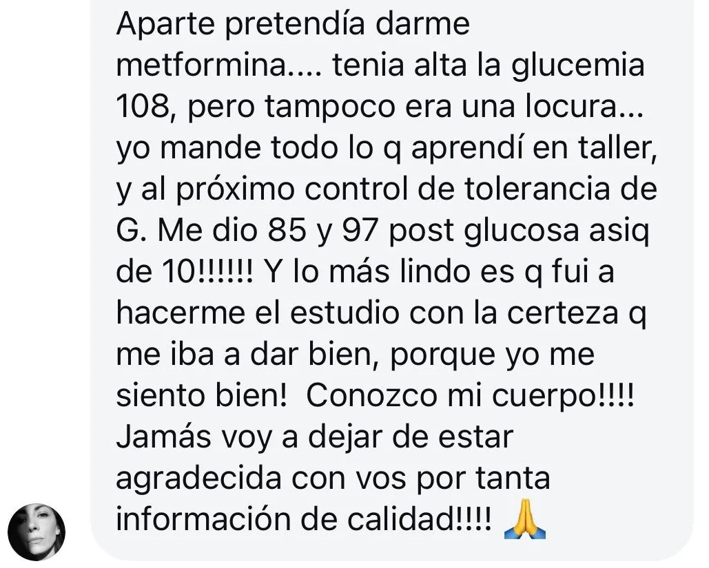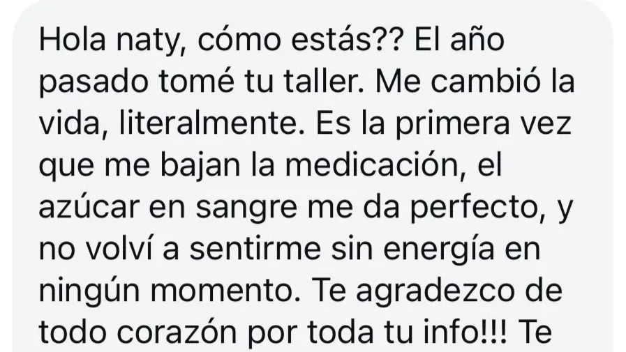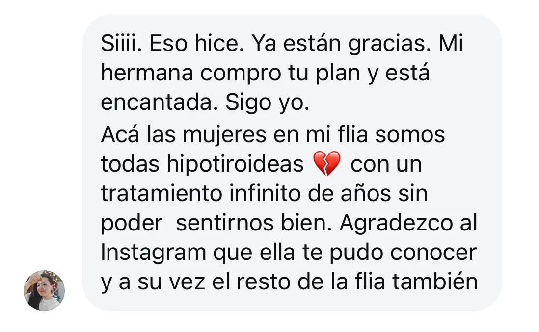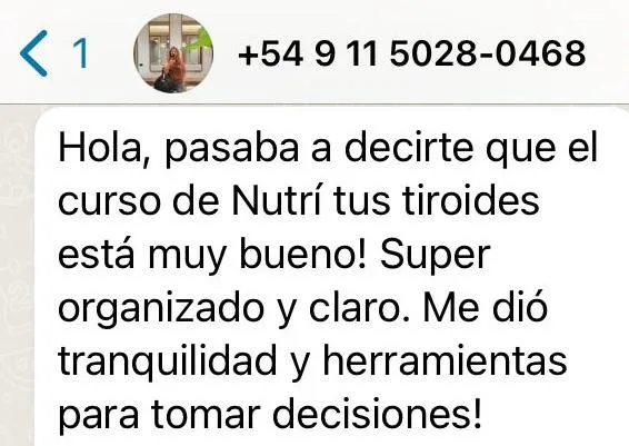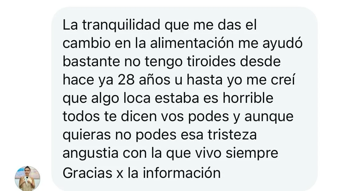 Mi endocrinóloga vio los análisis después de haber hecho “nutrí tu tiroides” y me dijo que íbamos a probar bajar la medicación. ¡Gracias, gracias, gracias! Nunca pensé que eso era una posibilidad y es todo gracias a tu curso.